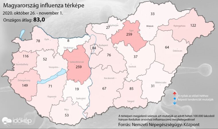 Az Influenzatérkép a Nemzeti Népegészségügyi Központ hetente megjelenő tájékoztatója alapján készül. A térképen látható adatok a 100 000 lakosra vetített, influenzás tünettel orvoshoz fordulók becsült számát mutatja, megyés bontásban. A tényleges influenzás betegek száma ettől eltérhet.