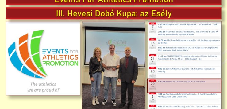 Természetesen szó esett a III. Hevesi Városi Dobó Kupáról is, amely jövőre az Events for Athletics Promotion (Rendezvény az atlétika népszerűsítéséért) versenysorozat egyik állomása lesz. Ezzel Heves olyan városokkal került egy csoportba, mint pl. Amszerdam, Glasgow, Berlin, Budapest és Palermo. Nagy esély ez, nem csak a hevesi atlétikának, de a városnak is, hiszen a dobó kupára várhatóan tucatnyi európai országból érkeznek majd atléták. Csak rajtunk múlik, hogy milyen vélemény alakul ki majd bennük a városunkról és a versenyről. Reméljük, ugyanolyan jó, mint az idei verseny sztárjában, Franck Elembában, akinek komoly szerepe volt abban, hogy az EAP elnöksége “üzent” a szervezőknek: szívesen látnák a pályázatot a novemberi máltai konferencián. Ezúton is köszönetet mondunk Téglássy Tímea segítségéért a Magyar Atlétikai Szövetség részéről, illetve Kovács Noelnek, aki a verseny prezentációját mutatta be.