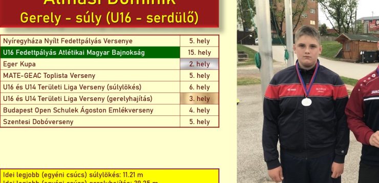 Idei első éve volt Almási Dominiknak az U16, vagyis serdülő korosztályban. Gerelyhajításban és súlylökésben is többször rajthoz állt, az egyéni csúcsát több alkalommal is megjavította mindkét versenyszámban. Jövőre még mindig ebben a korosztályban fog versenyezni.