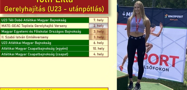 Tóth Lilla stabilan szerepelt ebben az esztendőben, az országos bajnokságokon is a nyolc között tudott végezni, sőt az egyetemisták bajnokságán a dobogóra is felállhatott. Az egyéni rekordját három alkalommal javította meg idén, és átlépte a 40 méteres határt. A következő esztendő lesz számára az utolsó év az utánpótlás korúak között, azelőtt, hogy 2026-ban majd a felnőtt mezőnybe lépne.