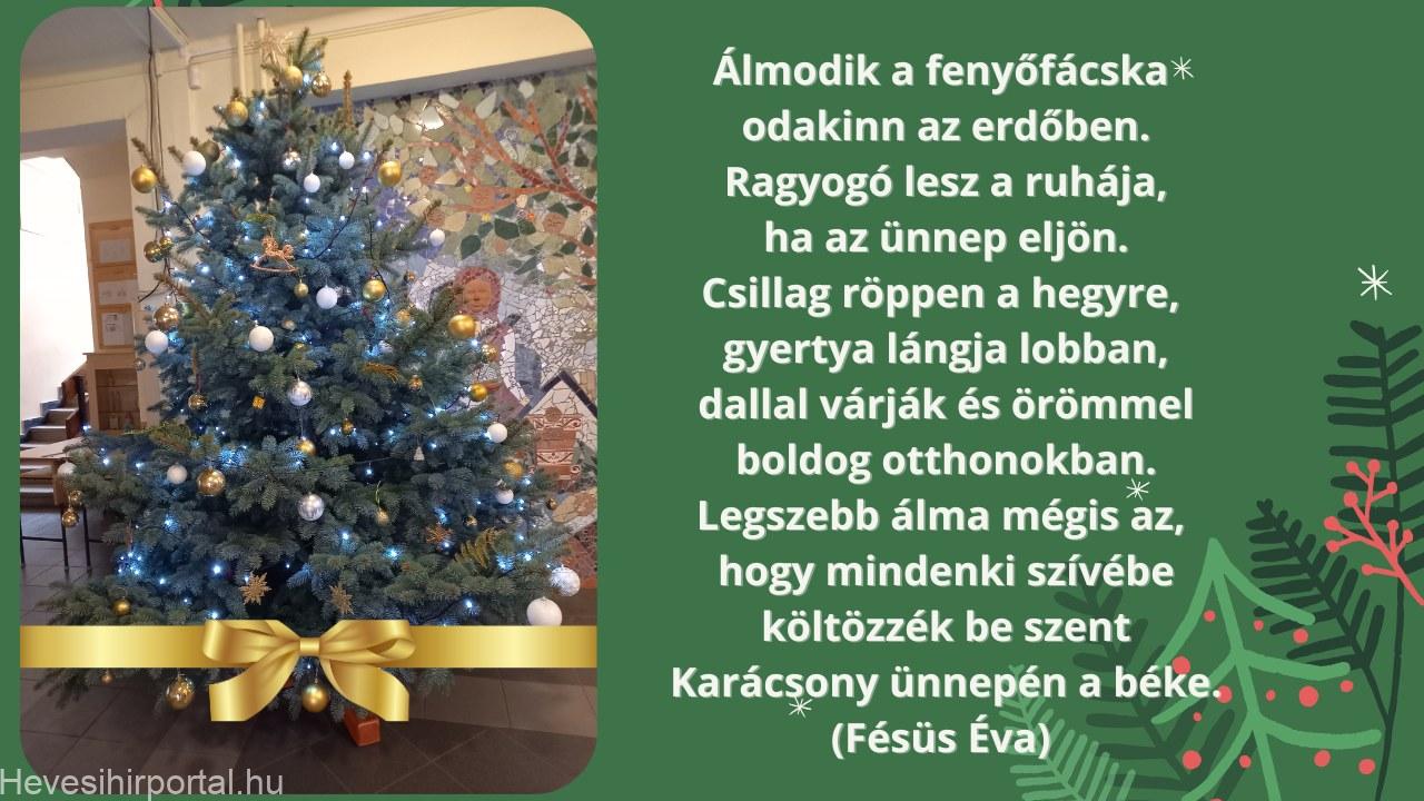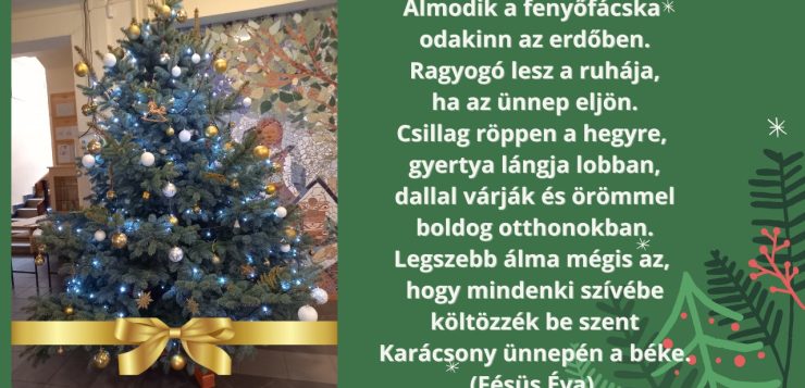 Az iskola karácsonyfája ünnepi díszbe öltözve köszönti a közelgő adventi időszakot. A fenyőfát Mészárosné Tóth Melina és Mészáros László felajánlásának köszönheti az intézmény.