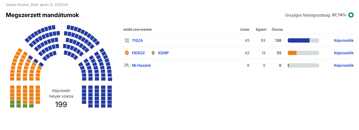 Az országos adatok – 97,74 százalékos feldolgozottság mellett – szintén jelentős politikai fordulatot jeleznek. A részvétel országosan 79,48 százalék volt.